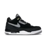 This AJ 3 is a spin off of the classic ?Black Cement? that has been a street favorite since its release in 1988. A black suede upper with a familiar elephant print mudguard is featured, but instead of the elephant print sporting grey tones, it is black. A grey Swoosh overlays the upper, drawing inspiration from Tinkers first projects for Nike. A white midsole, grey outsole, and gold hardware completes the design.