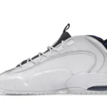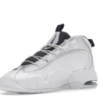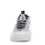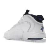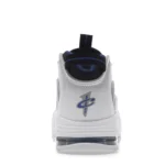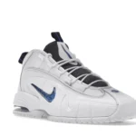 The Nike Air Max Penny 1 Home 2022 has a white sole that features royal blue gel. The base of the shoe is white with black and blue details on top. The iconic Swoosh appears on the side in a transparent blue gel.