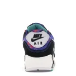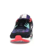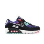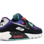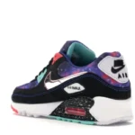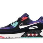 The Nike Air Max 90 Supernova (2020) features a black, white, and multicolored leather and textile uppers, with the soft underlays sporting a galaxy-like print that includes bursts of blue, black, red, pink, and white. From there, Nike branding on the tongue and an exposed “Air Max” sole complete the design.