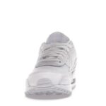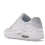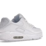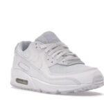The Nike Air Max 90 triple white features a white upper with white leather , net overlays and a plain lacing section.