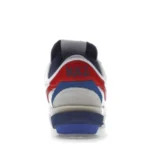 The NIKE Cortez 40 Sacai in Red and Blue has double-stacked detailing, technical enhancements, and a blue color scheme. It has a sharply-lined midsole with an extended slab of foam on the heel and a puck-like exposed Zoom Air unit on the forefoot. The top half is a mixture of leather and suede. The sneaker features two swooshes, heel overlays, tongues, and a second collar, rising slightly above its counterpart.