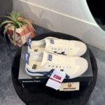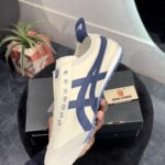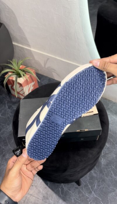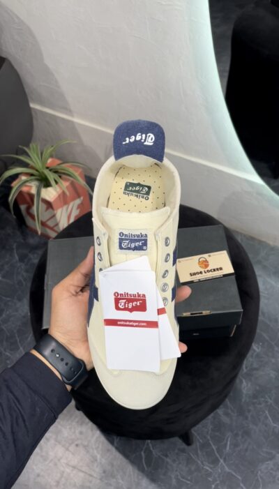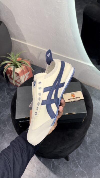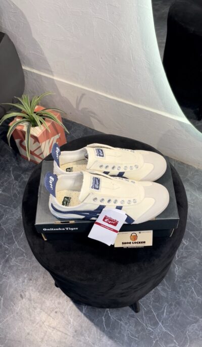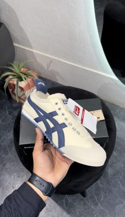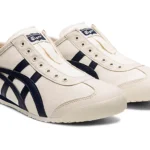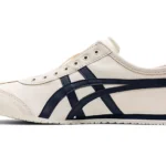 ONITSUKA TIGER MEXICO 66 SLIP ON CREAM BIRCH MIDNIGHT is a sleek and convenient adaptation of the classic Mexico 66. Designed for easy wear, this version eliminates the need for laces, featuring elastic panels that ensure a snug fit. Maintaining the iconic style elements of the original, such as the signature tiger stripes and premium leather and suede materials, the Slip-On provides the same timeless appeal with added convenience. The cushioned insole and arch support offer superior comfort, making it perfect for everyday wear. Ideal for those who value both style and practicality, the Onitsuka Tiger Mexico 66 Slip-On combines heritage design with modern ease.