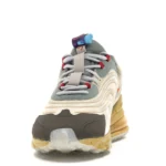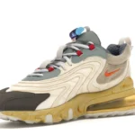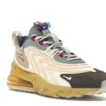 This Air Max 270 consists of a mesh upper with tumblr leather and suede overlays. A gold midsole, green tongue with attached lace locks, and Cactus Jack branding on the heel tabs completes the design.