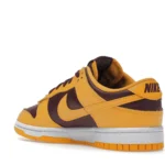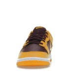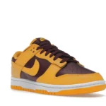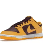 This low-profile shoe also has a mesh tongue and sock liner in the same color-blocking design. Other details include yellow Swooshes, a lace-up closure system with bordeaux laces, a perforated toe box, and branding on the heel tab, tongue tab, and insoles. The white midsole sits on a yellow rubber outsole that has a visible linear pattern for traction.
