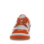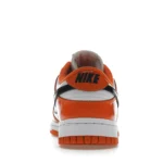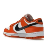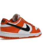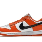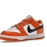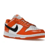 The dunk Low for women features a white leather base, patent leather overlays, and black Swoosh logos on the shoe sides. The tongue and shoelaces are orange. The shoes have bright orange outsoles underneath and white rubber midsoles which also complete this shoe design.