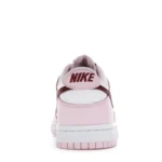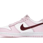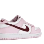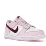The dunk Low Pink Red White GS features a white leather upper complemented by pink overlays and a deep red, purple-like shade marking the Swoosh