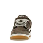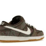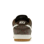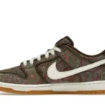 The SB dunk Low Pro Paisley Brown features a brown, green, and red paisley-patterned textile upper with matching leather overlays and contrasting Swooshes. SB woven tongue tags and white heel embroideries add further detailing. At the base, a white Zoom sole with a gum outsole completes the design.